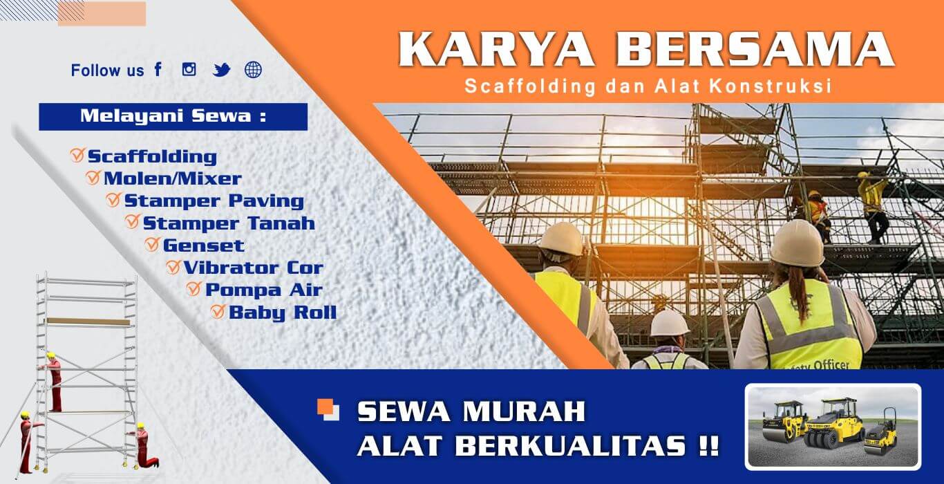 KARYA BERSAMA merupakan perusahaan yang bergerak dibidang jasa persewaan scaffolding dan alat kontruksi yang meliputi sewa molen/mixer, stamper paving, stamper tanah, genset, vibrator cor, pompa air, dan baby roller. KARYA BERSAMA telah dipercaya untuk menangani proyek – proyek Pemerintah. Melayani untuk seluruh wilayah Jawa Tengah dengan cepat dan mudah serta tarif sewa yang sangat terjangkau sehingga sangat menguntungkan bagi Anda.